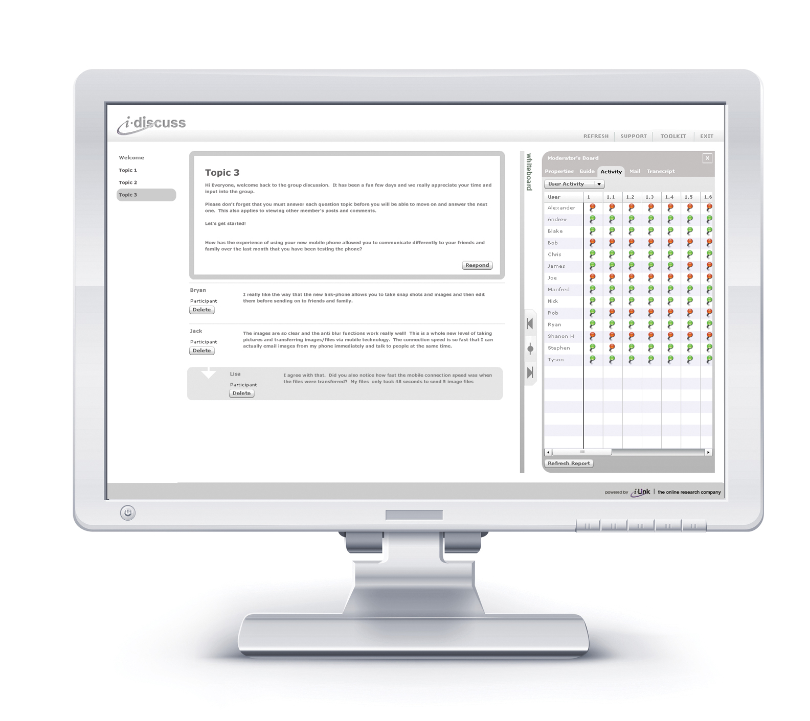 i-Discuss is i-Link's application for managing over-time discussion groups. I-Discuss features a range of flexible set up and reporting options it also includes leading stimulus display and control capabilities for conducting online focus groups with ease.